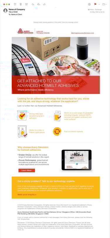 Client comes to us with for their new product, hotmelt adhesives, so we prepare something hot for them. Including content, email direct mailer design and HTML and get them distribute digitally as well.