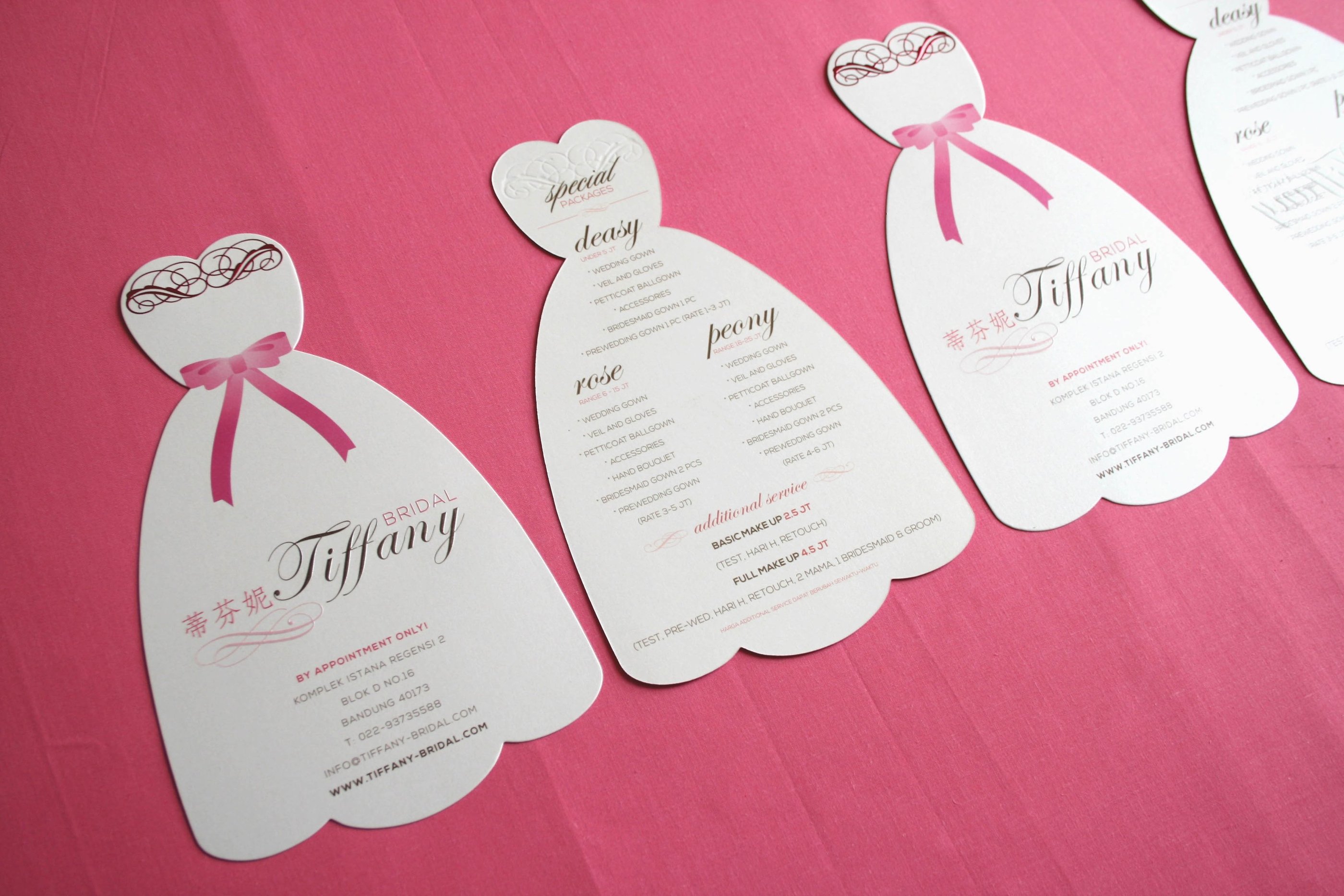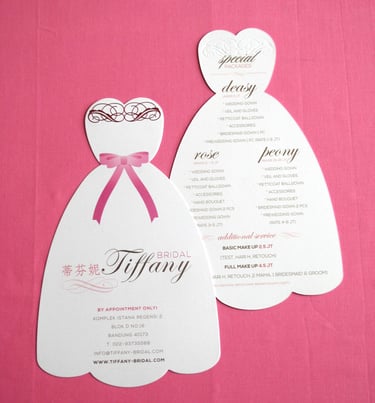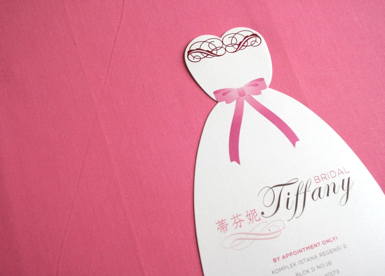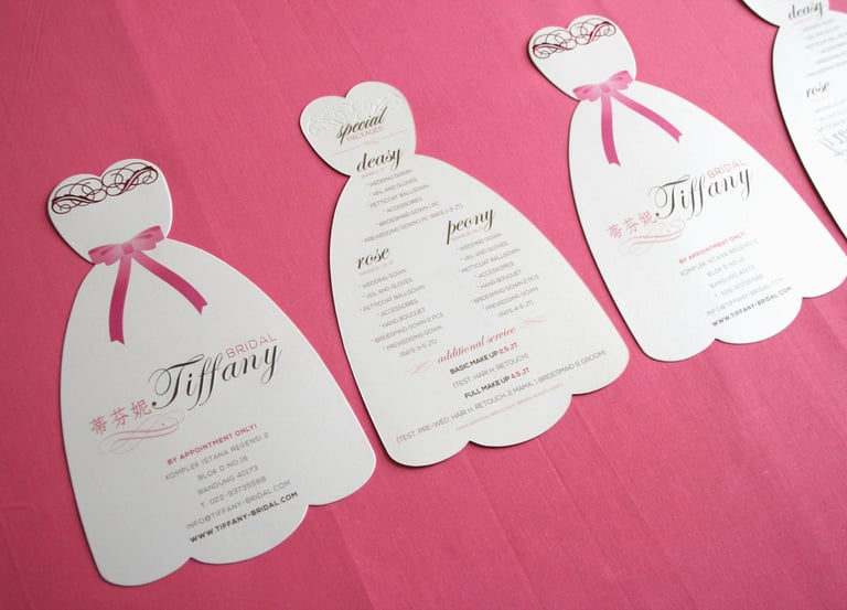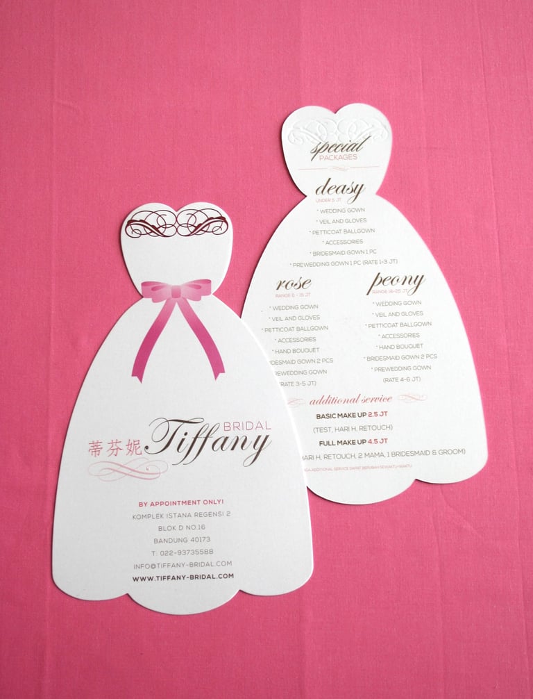 A young lady comes to me, and said, i need your fresh new ideas for my brand and print collaterals. She said: "With your background and experience i'm sure you will have an amazing ideas." I said: thank you so much sis for that acknowledgement. I only ask one question: how willing are you to go further and out of the box?". After a quick chat and pitching about my ideas, there we are, going right on point to the business itself, which is a bridal shop, die-cut flyer to leave an impressive first reaction for everyone who received the flyer in wedding exhibition: 'WOW, this is so beautiful' and YES, this is a total success!